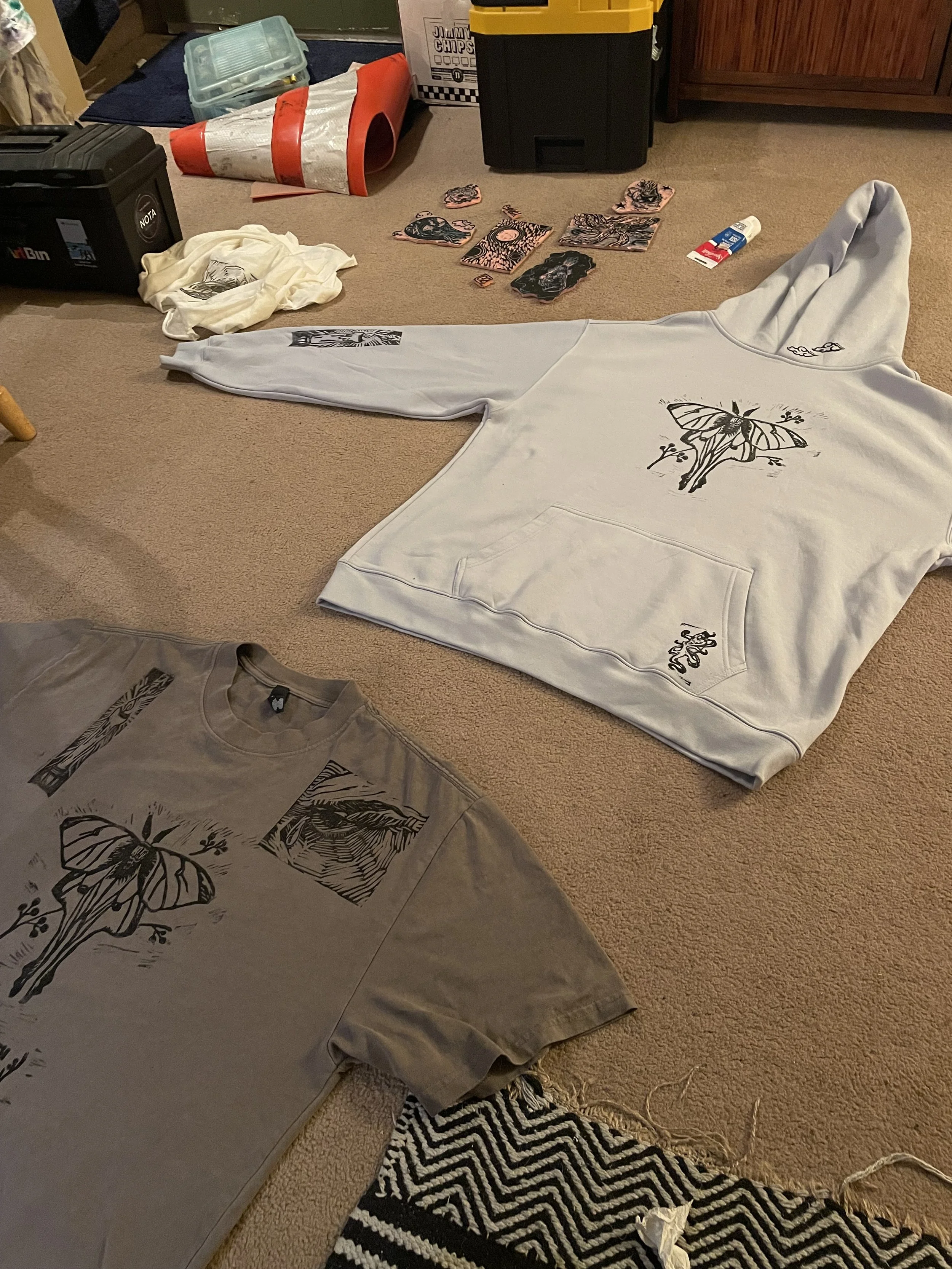 I’d also been eager to experiment with a split fountain technique in screen printing, blending multiple ink colors directly on the screen to create one-of-a-kind gradients. This design offered the perfect opportunity. I paired it with a vintage-inspired tank top, chosen for its soft texture and natural tone, which complemented the layered textures of the print. The result is a piece that feels tactile, experimental, and completely unique—no two prints the same.